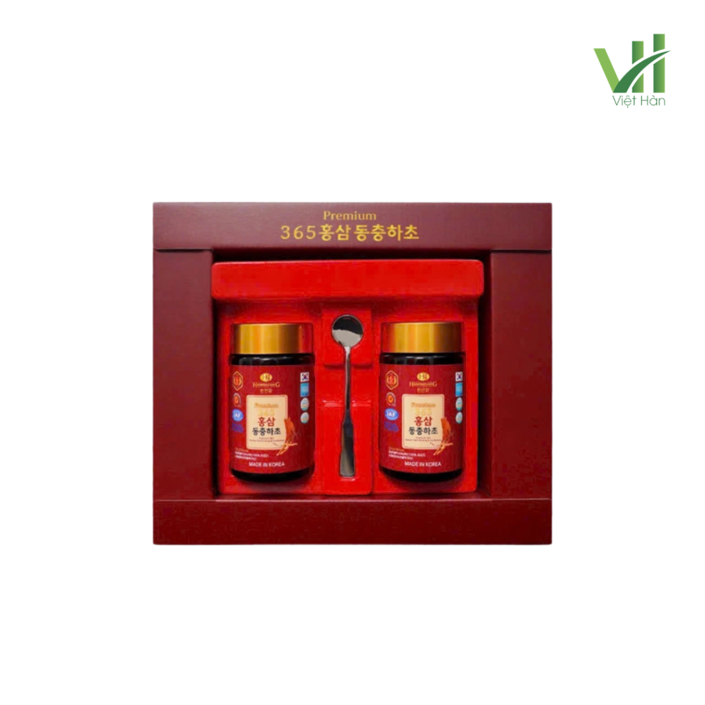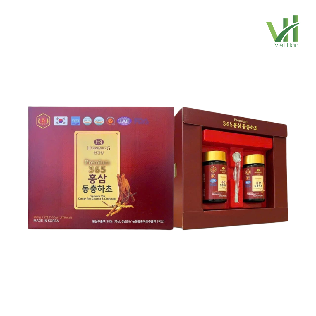 Cao hồng sâm đông trùng Hankwanjang Premium 365 là dòng sản phẩm chăm sóc sức khỏe cao cấp được nhập khẩu trực tiếp từ Hàn Quốc. Sự kết hợp tinh tế giữa hai loại dược liệu quý giá là Hồng sâm 6 năm tuổi và Đông trùng hạ thảo mang đến một giải pháp hỗ trợ bồi bổ thể trạng toàn diện, an toàn và hiệu quả cho người sử dụng.