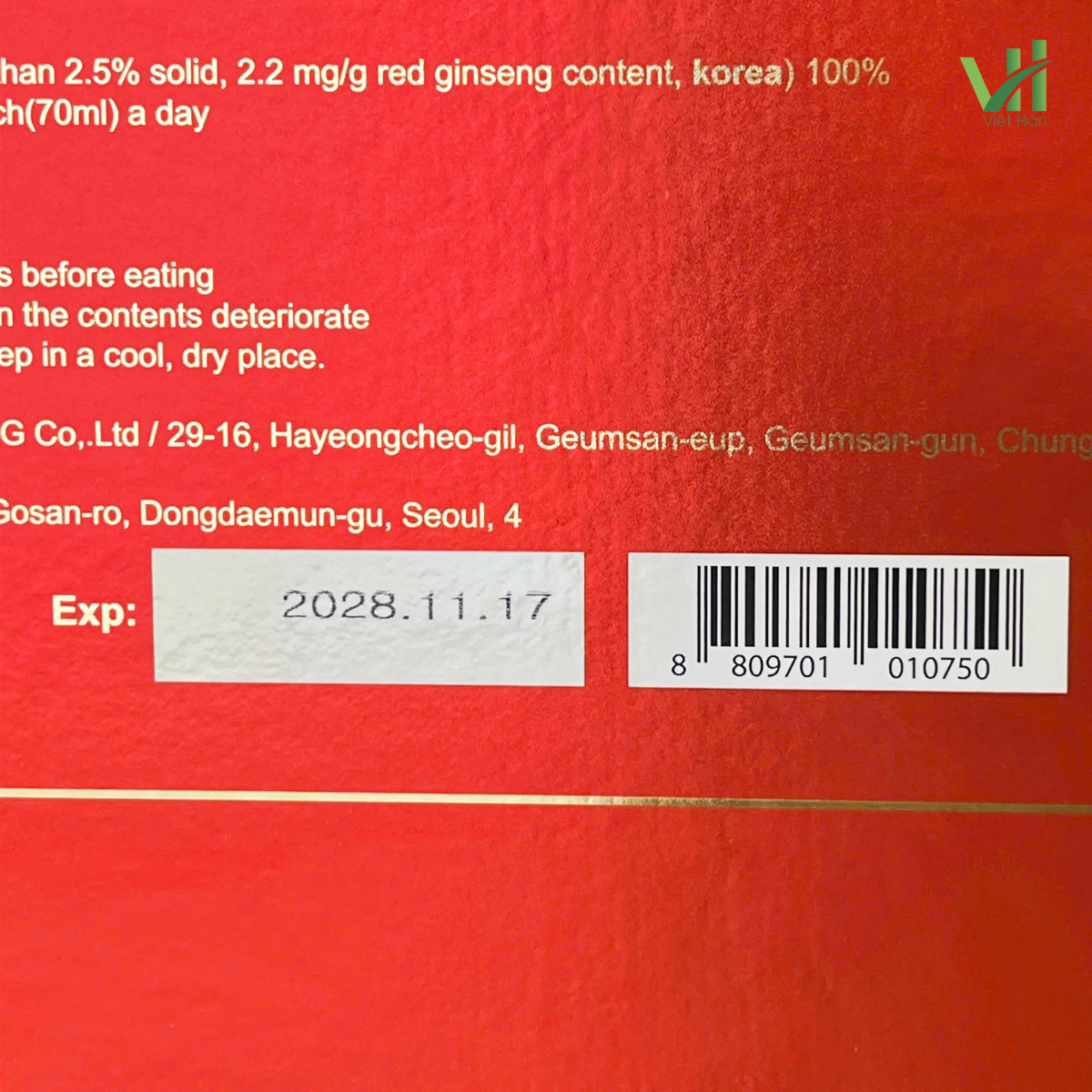 - Chiết xuất hồng sâm 6 năm tuổi Hàn Quốc (chất rắn 2.5% trở lên, thành phần hồng sâm 2.2 mg/g Hàn Quốc).